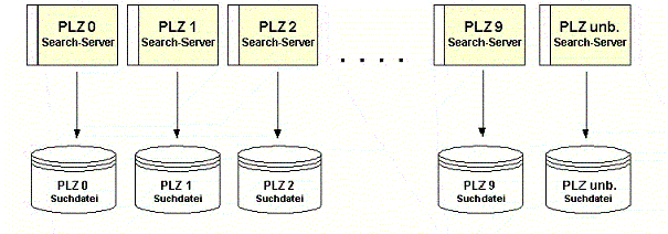 Jeder einzelne PLZ-Bereich kann hierbei an einen dedizierten Search-Server geknüpft werden, der betriebssystemseitig wiederum als Prozess auf einem Prozessor abläuft. Dadurch wird erreicht, dass bspw. nach einem Namen in allen PLZ-Bereichen gleichzeitig gesucht werden kann, wenn jegliche Angabe wie Ort, PLZ und/oder Straße, die eine Bestimmung des PLZ-Bereiches ermöglicht, fehlt.