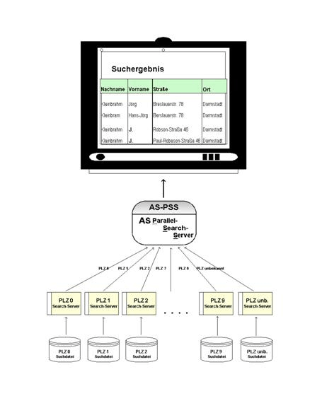 Die somit gewonnene Möglichkeit der parallelen Suche erfordert ein zentrales Modul, das einerseits die Weiterleitung einer Suchanfrage and die Einzelprozesse je PLZ-Bereich weiterleitet und ebenso die von diesen zurückgelieferten Resultate wieder bündelt und als Gesamtergebnis zur Verfügung stellt. Diese Aufgabe übernimmt das Modul „AS Parallel Search Server“ (AS PSS).